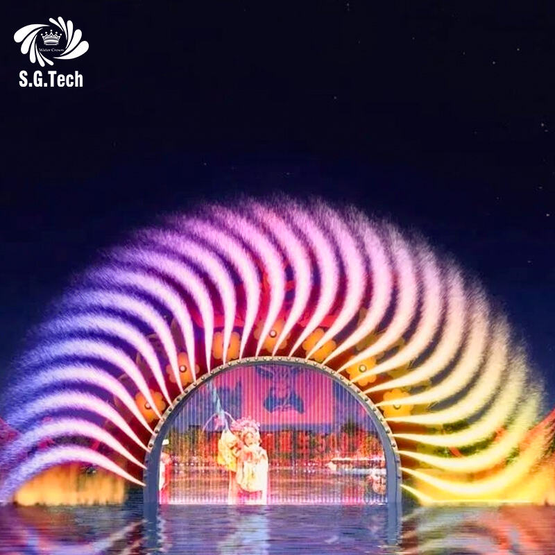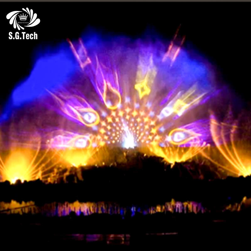 fontaine musicale dansante extérieure 2026 avec lumière laser, écran d'eau projecteur sur lac, fontaine lumineuse RGB DMX512